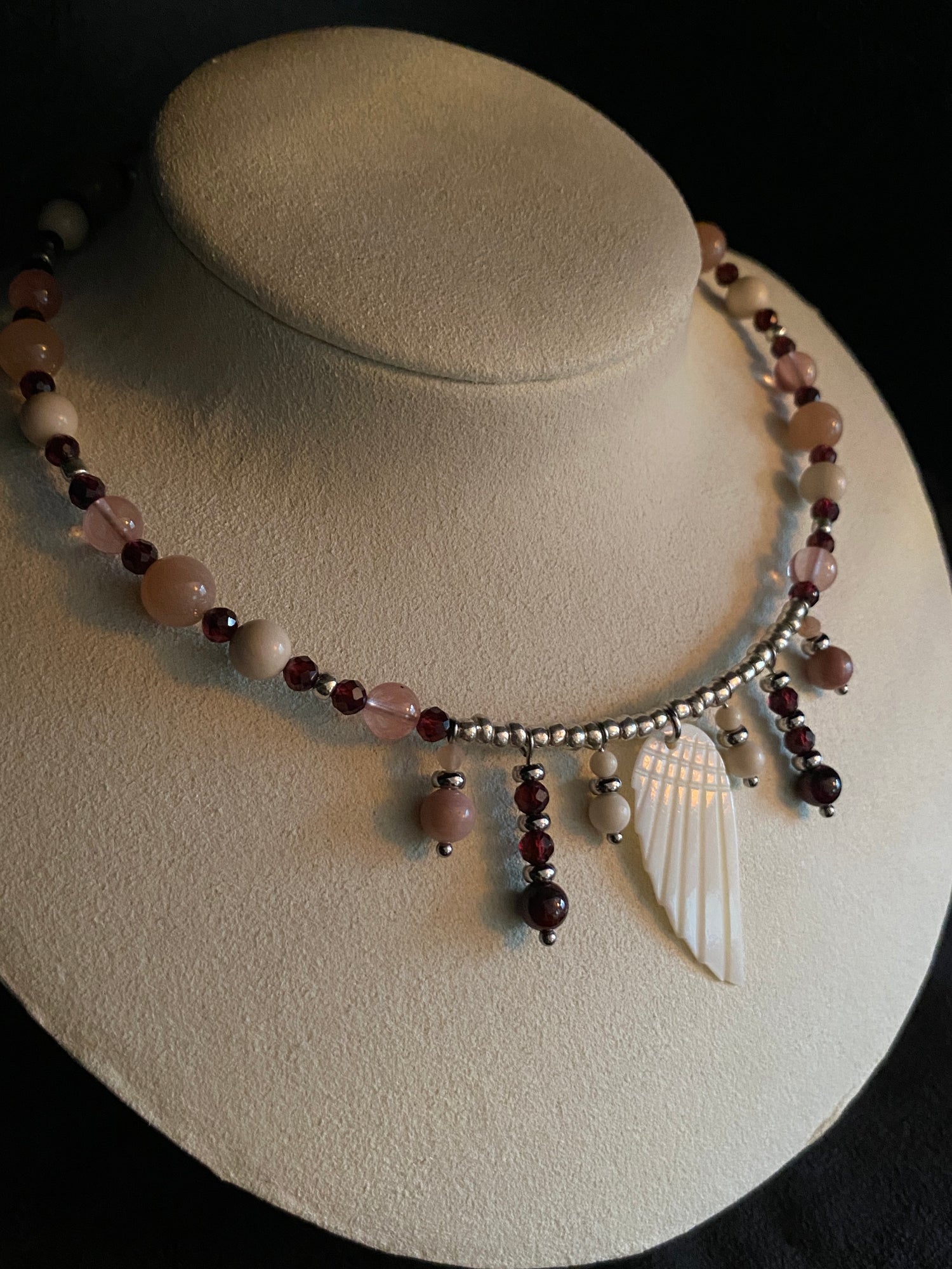 Part of the “Angel” range! This stunning choker has been made from a mix of crystals including: River Stone, Sunstone, Cherry Quartz, Garnet & Rhodonite. Not forgetting the centre piece ~ a stunning Mother of Pearl angel wing.