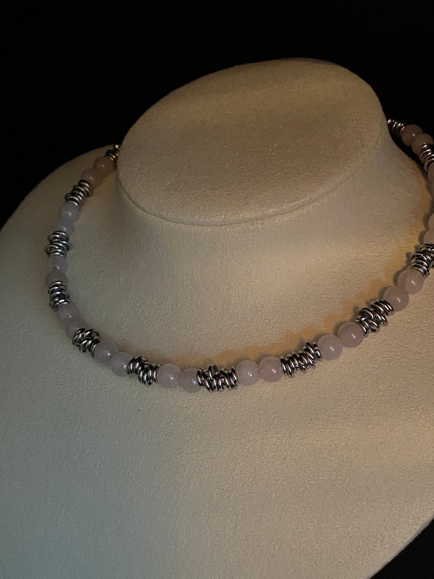 Part of the “Angel” range! Simple and clean line choker made from pale pink natural Rose Quartz beads and Stainless Steel jump rings. Beautiful 🤍